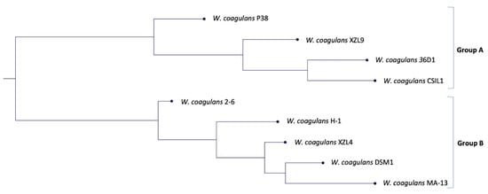 In microbial genomics, phylogenetic analysis is crucial not only to establish the genetic novelty and the genotype–phenotype relationships of the isolates but also to identify the closest relatives within assembled genomes. With this aim, a species tree was generated using the genomes of nine W. coagulans strains available in the KBase system.