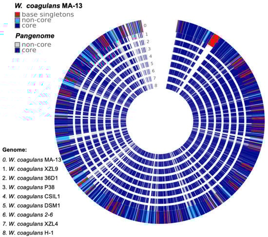 W. coagulans is a homofermentative microorganism, which produces LA from glucose via the Embden–Meyerhof–Parnas (EMP) pathway and from xylose via the pentose phosphate pathway (PPP) or the phosphoketolase pathway (PKP). Specifically, the yield of LA varies from 60 to 98% of the total fermentation products depending on whether xylose is metabolized through one or the other pathway []. Interestingly, genomic comparison among different W. coagulans strains have revealed that some of them lack at least some of the genetic determinants of the pentose phosphate pathway, hinting at a significant metabolic and genomic diversity among the isolates [,,]. On the other hand, knowledge of the genomic features of the different W. coagulans strains is essential to fully exploit their potential in the white biotechnology applications []. Indeed, W. coagulans is also emerging as a promising GRAS (Generally Regarded As Safe) probiotic candidate, by sharing characteristics with both Bacillaceae and Lactobacillaceae []. Currently, W. coagulans strains are widely used as probiotics in marketed worldwide formulations namely, Sustenex, Lactospore, Neolactoflorene, etc. []. In a recent study, it has been demonstrated that MA-13 over-produces under standard growth conditions α- and β-galactosidases that are key enzymes for improving the nutritional value of lactose-containing food as well as for the production of galactooligosaccharides (GOS) that improve the digestibility and nutritional value of food. Moreover, the identification and comparative analysis of the full repertoire of W. coagulans CAZymes might help to shed light on the probiotic and prebiotic properties of the available strains []. Furthermore, W. coagulans has been also exploited in other diverse biotechnological applications such as in medicine, food, and chemical industry including the production of thermostable enzymes and antimicrobial peptides, such as coagulin []. Likewise microorganisms isolated from food fermentation or spoilage, Firmicutes display a significant variation within a given species, especially for gene clusters involved in the fitness or adaptation to specific conditions []. So far, many W. coagulans strains have been isolated and the genome sequences of 47 and 24 are available on National Center for Biotechnology Information (NCBI) and Integrated microbial Genomes (IMG), respectively (1 February 2022) [,,,]. To fully explore the biotechnological potential of MA-13, a comparative analysis among the 9 selected strains has been carried out. Genome decoding is functional to unravel molecular mechanisms driving diversification, genetic variability, and host–pathogen interactions []. Previously, a comparative genomic analyses on a few W. coagulans strains with a special focus on carbohydrates catabolism and genetic determinants responsible for general defense systems from foreign DNA has been reported []. In our analysis, we picked up the closest evolutionary related strains to MA-13 and pinpointed the core, the dispensable genes that are present in some but not all the strains studied (non-core) as well as the strain-specific genes (singletons) related to CAZymes, protein secretion systems, antimicrobial peptides/proteins, secondary metabolites, and the defense systems protecting cells from foreign DNA. Moreover, we show that the genomic content varied among close individual strains, and such variations are traced back to the gain or loss of singleton, genomic islands, selfish DNA (plasmids, bacteriophages, integrative conjugative elements), and/or widespread horizontal gene transfer (HGT) [].