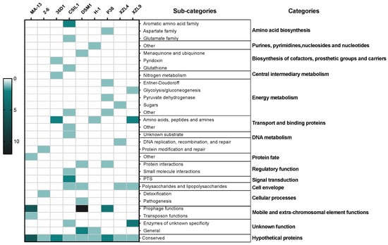 The genomic diversity and variability among the isolates are highlighted by the analysis of singletons and non-core genes that may be lost or acquired from distal lineages through horizontal gene transfer and represent the genetic source for the emergence of novel variants (Figure 2, Table S2). To assess the functional features of singletons, TIGRFAM was used to cluster proteins in categories and sub-categories (Figure 3). Genes involved in central metabolism as well as several hypothetical coding sequences and some with unknown functions are distributed over all the genomes. Moreover, a distinctive feature is the presence of prophage elements that are found only in MA-13, DSM1, and P38 (Figure 3). These strains are also characterized by singletons related to the functions of mobile genetic elements. This feature points to the availability of genes attainable by the evolving microbial population and to the capability of microbial genomes to acquire new functions. The distribution of singletons in the MA-13 strain revealed a significant proportion (~40%) of them falling within the hypothetical proteins category with unknown function thus indicating that a significant portion of them is still “terra incognita” and therefore the full understanding of its genomic potential needs to be still unveiled (Table S3). Moreover, transposable elements provide microorganisms with the ability to be responsive and susceptible to environmental changes by acquiring new genetic material and disseminating regulatory elements. The presence of singletons related to transposon activity, which is a distinctive feature of MA-13, points to significant genome plasticity, possibly to meet the requirements of environmental adaptation.