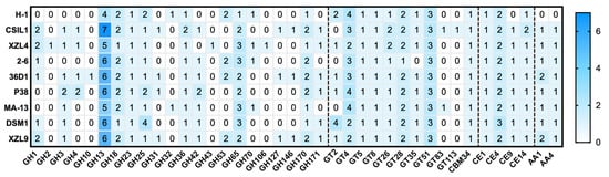 Carboxyl Esterases (CEs) release acyl or alkyl groups attached by an ester linkage to carbohydrates []. Among the 18 CEs families, only four of them were annotated in this analysis. CE1, CE4, CE9, and CE14 are found in almost all the strains.