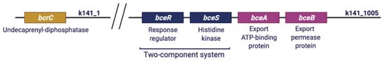 Another strategy to withstand exposure to toxic compounds is antimicrobial resistance (AMR) which refers to the ability of microorganisms to cope with the effects of antibiotic treatments or antimicrobial peptides []. To identify genomic regions possibly related to AMR, an in silico analysis of W. coagulans “resistome” was performed using PATRIC software. The output of this analysis is a list of gene products that are mostly related to functions of the central metabolism and are potential targets of environmental stressors upon genetic mutations. Then, PATRIC results need careful interpretation since the presence or the absence of some genes cannot be traced back to susceptibility or resistance to certain compounds unless biochemical and/or physiological characterization are carried out. Examples are gyrA, gyrB, and murA present in all the strains that might be antimicrobial target of fluoroquinolone (Table S4). However, no inference can be drawn in regard of fluroquinolone resistance/susceptibility since a physiological characterization has not been carried out for any of the strains. Interestingly, PATRIC analysis revealed the presence of a gene cluster encoding for resistance to a cyclic peptide (bacitracin) in MA-13. In antibiotic-producing bacteria, it is known that biosynthetic operons of peptide antibiotics are frequently associated with membrane drug efflux transporters of the ABC family, which pump out the antibiotics for self-protection [,]. Accordingly, all W. coagulans strains analyzed bear three genes encoding for efflux pumps (bceA, bceB, bcrC). Furthermore, MA-13 is the only strain with a complete genetic array responsible for resistance to bacitracin including the two-component signal transduction system (bceRS) which is adjacent to the efflux transporter genes (bceA/B) (Figure 5). This genetic proximity is common to other Bacillus species [] and the relative genes are located on contig k141_1005 in MA-13. In this system, BceR is a sensory transduction protein that responds to extracellular bacitracin stimulus and transmits the signal to the regulator BceS. This latter binds the promoter region upstream to bceA/B genes affecting their expression. Whilst the presence of a complete bceRS/AB gene cluster is quite widespread among other Bacillus species [], MA-13 exhibits another genetic determinant of bacitracin resistance, i.e., bcrC encoding for a broad-specificity multidrug efflux pump which is located on a genomic region (contig k141_1) distant from the bceRS/AB genetic array. MA-13 BcrC protein is homologous (31.3% a.a. sequence identity) to BcrC of Bacillus licheniformis, a hydrophobic protein functioning as a membrane component of the permease []. Although some Bacillus species bear a complete three-components operon bcrABC, it has been demonstrated that the presence of the bcrC gene is sufficient to confer bacitracin resistance [] (Figure 5). To sum up, the current analysis demonstrates the presence of putative gene target(s) that may account for tolerance to bacitracin.