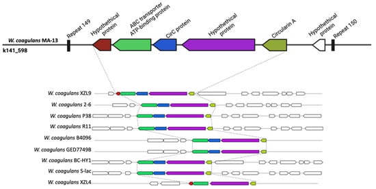 To understand the potential of MA-13 in the production of secondary metabolites, the genome was analyzed using antiSMASH, a bioinformatic tool suitable to search for clusters involved in secondary metabolites synthesis (Figure 6). From this analysis, a gene encoding for a non-lanthionine-containing peptide (class II bacteriocins), the circularin A, was identified. Circularin A is usually produced as a pre-peptide that undergoes a proteolytic cleavage of the leader sequence followed by head-to-tail ligation between the N- and C-termini to produce a smaller circular antimicrobial peptide []. This bacteriocin is usually encoded by a set of 4–10 genes usually organized in cluster. A genetic arrangement formed by ORFs encoding for circularin A, CircC, ABC transporter, and two hypothetical proteins were found in MA-13 on contig k141_585. A similar structure is shared with almost all the strains analyzed (Figure 6), but in the case of MA-13, the region is delimited by two repeats. Moreover, given the presence of several surrounding mobile elements, among which a transposase IS4, it is likely that the acquisition of this genetic cassette occurred upon HGT in MA-13. The strain XZL4 is the only one missing the circC gene, whose product is known to have a central role in the maturation of circularin A. Bacteriocin production could be considered advantageous to the producer since these peptides can kill or inhibit bacteria by competing for the same ecological niche or the same nutrient pool. Noteworthy, probiotics that synthetize bacteriocins are of particular importance because these bacteria are widely used in dairy industries.
