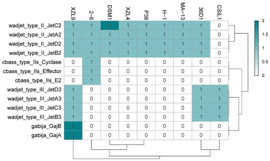 Prokaryotic immunity is constituted by multiple systems to defend from mobile genetic elements (i.e., viruses and plasmids). Innate defense mechanisms do not require previous exposure to a pathogen. The examination of the different W. coagulans genomes revealed the ubiquitous presence of the Wadjet defence immune system in all the strains analyzed (Figure 7 and Table S5) []. Wadjet cassettes are composed of the four genes jetABCD, where JetABC are homologs of the bacterial condensins MukF, MukE, and MukB, respectively. Bacterial condensins are involved in DNA condensation and segregation during bacterial replication. The fourth component of the operon, JetD, has a putative topoisomerase VI domain. Three types of Wadjet systems have been described, reflecting the domain organization of its components within the cassette []. W. coagulans strains predominantly contain type II Wadjet systems, although 36D1, CSIL1, and XZL9 harbor type III Wadjet operons (Figure 7). Wadjet system has been related to antiplasmid defense in the Gram-positives Bacillus cereus Q1 and Mycobacterium smegmatis [] where it impairs plasmid transformation and plasmid segregation to daughter cells, respectively. It can be hypothesized that the presence of Wadjet systems in W. coagulans is involved in preventing the acquisition of DNA from the environment. This would hamper the development of genetic systems for these strains, similarly to what occurs in M. smegmatis, where disruption of this system allowed the transformation and maintenance of plasmid pAL5000 []. Other isolated defense systems are present in W. coagulans. Strains 2–6 harbor a single CBASS (cyclic-oligonucleotide-based anti-phage signaling systems) cassette in addition to a type II Wadjet system (Figure 7) []. CBASS systems are constituted by an oligonucleotide cyclase that produces cyclic nucleotide secondary messengers upon the encounter of a pathogen, and an effector protein. They are classified into four types according to their operon organization, type of effector, and cyclic nucleotide messenger. In particular, effectors of type II CBASS systems contain ubiquitin-associated domains and their mechanism of action are still unknown given that ubiquitin has not been found in bacteria. However, this system confers protection against phages in E. coli and V. cholerae. Strain XZL9 harbors two Wadjet cassettes of types II and III, plus two Gabija loci (Figure 7). The Gabija system is composed of proteins GajA and GajB where GajA is a sequence-specific DNA nicking endonuclease and GajB is predicted to be a UvrD-like helicase. It is that GajA nuclease activity is activated by the change in the intracellular nucleotide levels resulting from virus replication and transcription, thus eliciting bacteriophage resistance [].
