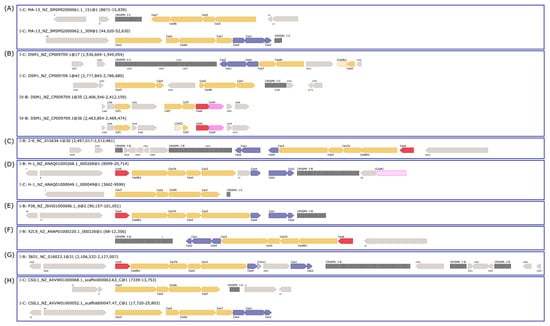 CRISPR-Cas cassettes present in W. coagulans genomes. The cas operons for each strain are depicted: (A) MA-13, (B) DSM1, (C) 2–6, (D) H-1, (E) P38, (F) XZL9, (G) 36D1, and (H) CSIL1. The headers above each operon refer to the type of cas operon, strain, contig, and location. The color of cas genes corresponds to their associated stage of the CRISPR-Cas response: blue—adaptation; yellow—interference; and red—crRNA maturation. CRISPR arrays are depicted as black, vertical lines.