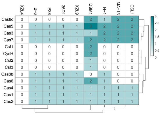 Heat map distribution of cas operon genes among W. coagulans strains. Green and white represent the highest and lowest number of genes.