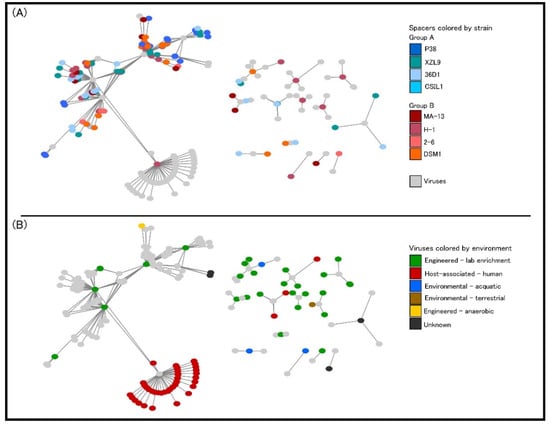 At present, it is not clear whether orphan CRISPR arrays are indeed functional, although several lines of evidence indicate that at least some isolated CRISPR arrays are active [,]. Strains 2–6, 36D1, and CSIL1 have orphan arrays with a repeat different to the one of the CRISPR array associated with their cas operon and adaptation cassette. Moreover, in strains 36D1 and CSIL1 this repeat is predicted to belong to another CRISPR subtype. A similar picture is seen for strain DSM1, which has an adaptation cassette associated with an I-C CRISPR system, but an orphan array with a different direct repeat. These arrays could represent a remnant of a cas operon previously present in the genome that was subsequently lost. Additionally, strain H-1 bears interference cassettes for both I-B and I-C subtypes, but an adaptation cassette only for the I-B operon (Table 4). The repeat of the associated CRISPR arrays is different for each subtype, suggesting that both cas operons are capable of interference, but only the I-B cassette may be able to acquire new spacers. The low number of spacers in the I-C CRISPR arrays (3 to 5) could reflect its inability to acquire new spacers. Taken together, the distribution of CRISPR-Cas modules in W. coagulans strains suggests that loss and gain of CRISPR-Cas cassettes is a common trait in these microorganisms. From an applicative point of view, the endogenous CRISPR-Cas adaptive immune systems can be repurposed for genome editing of W. coagulans, potentially constituting a valuable tool in the genetic toolbox for these strains. Analysis of CRISPR spacer matches allowed the identification of viruses infecting the W. coagulans. From a pool of 651 spacers extracted from the strains, 113 spacers (17.3%) matched to 77 Firmicutes-infecting viruses in the IMG-VR database []. These viruses are classified as members of the class Caudoviricetes, with the majority of them (66%) belonging to the Siphoviridae family. Several viruses match to CRISPR spacers of strains from both clades of W. coagulans (group A and group B), suggesting that these strains share a common pool of viruses. Additionally, most viruses in the network originate from an engineered environment (e.g., lab enrichment), including all spacers from strain MA-13 (Figure 10B), while only four viruses derived from environmental ecosystems. Interestingly, one single spacer from strain H-1 matched 38 viruses, of which 36 originate from host-associated environments, particularly the human digestive system (Figure 10). The source of the W. coagulans viruses is in agreement with the prevalent agri-food origin of the isolated W. coagulans strains.