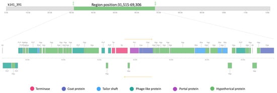 Linear genomic map of prophage phBC6A52 identified with PHASTER from MA-13 genome.