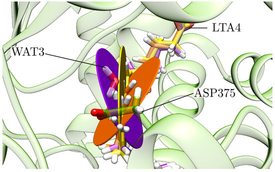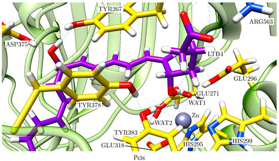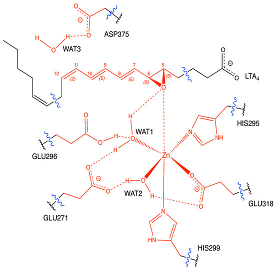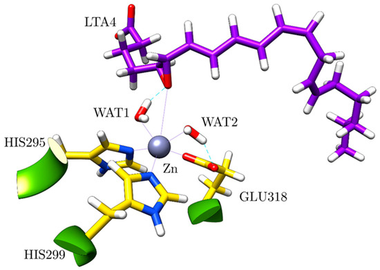 The Zn ion is the central atom of the catalytic domain of the protein. In good agreement with the crystallographic structures [18], in the optimised structure it is pentacoordinated to two HISs (HIS295, HIS299), GLU318, WAT1 and WAT2 with an octahedral geometry (distance RMSD compared to the ideal octahedron: 0.490 Å) [28], so a vacancy for the coordination is available (Figure 5). The free O from GLU318 is linked to WAT2 through a hydrogen bond. Moreover, there is a second coordination sphere, which initially contains the epoxide of LTA4, GLU271 (hydrogen-bonded to WAT1 and WAT2) and GLU296 (linked to WAT1 through a hydrogen bond).