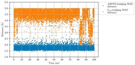 Distances ASP375-WAT (blue points) and C12-WAT (orange points) along the Molecular Dynamics simulation for the LTA4:LTA4H Michaelis complex. WAT stands for a water molecule placed between ASP375 and C12.