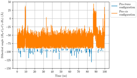 Dihedral angle H6-C6-C7-H7 along the Molecular Dynamics simulation for the LTA4:LTA4H Michaelis complex. The pro-cis configuration (orange line) corresponds to , whereas indicates a pro-trans configuration (blue line).