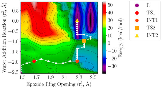 The conversion of LTA4 to LTB4 is unique because the water molecule is proposed [15,17] to be introduced stereoespecifically at a site (C12) six methylene units away from the epoxide moiety (C5 to C6), in what would be a 1,7-nucleophilic substitution. Although it is believed [17] to proceed by means of an SN1 mechanism, an SN2 mechanism should also be considered as possible. To unravel this point, a two-dimensional potential energy surface was built (see Figure 9) using a reaction coordinate for the epoxide ring opening ( = d(C6(LTA4) − Oepox(LTA4)), that is, the epoxide breaking bond length, and a reaction coordinate for the water addition to C12 ( = (d(O(WAT3) − H(WAT3)) − d(O(WAT3) − C12(LTA4))), that is, the difference between the water breaking bond length and the forming O–C bond length. The rest of the geometrical parameters in the active region have been fully optimised. R stands for the optimised structure (Figure 3, Figure 4 and Figure 5). Using the Dijsktra algorithm [29] we have also defined in Figure 6 the minimum energy reaction path (white points) on that surface and the minimum (R, INT1 and INT2) and maximum energy points along it (TS1 and TS2).