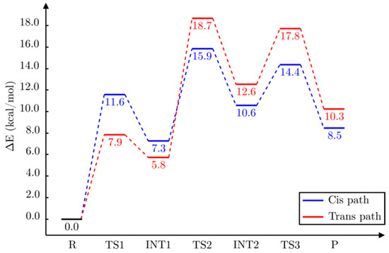 Let us describe the pro-trans reaction path now. In Figure 14, we show a succession of pictures of the stationary structures along this path. For the sake of clarity, in Figures S4–S6, we display representations of those stationary structures focused on the region where the corresponding step occurs in each case.