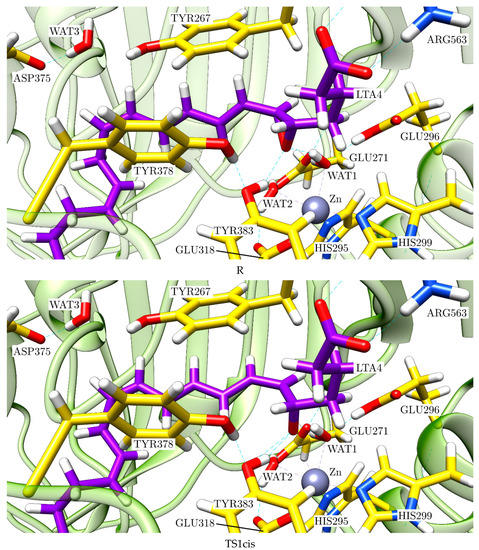 In LTA4, the bond C6-C7 has a configuration rather similar to pro-cis, although intermediate between the pro-cis and the pro-trans ones. As a result of the epoxide opening, the bond C6-C7 evolves either to a cis (Z) or to a trans (E) configuration. The triene moiety must twist to allow the bond C6-C7 to adopt its cis (Z) or trans (E) configuration, in such a way that it exposes the R face of C12 (by the side opposite to the Zn atom) or the S face of C12 (by the same side as the Zn atom), respectively, to the water addition. Only the cis (Z) configuration will lead to LTB4 (5S,12R-dihydroxy-6Z,8E,10E,14Z-eicosatetraenoic acid), whereas the trans (E) configuration would eventually form its stereoisomer 12S-6-trans-LTB4 (5S,12S-dihydroxy-6E,8E,10E,14Z-eicosatetraenoic acid). Thus, the two main stereochemical features that are required for the bioactivity of LTB4 appear to be closely linked.