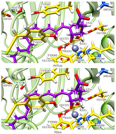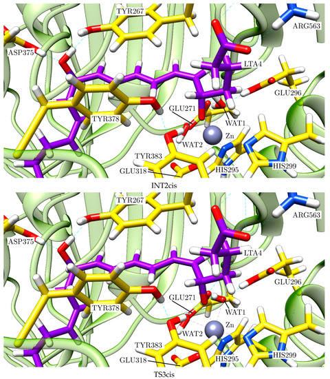 A final point to discuss is why LTA4H converts LTA4 into LTB4 instead of the stereoisomer 12S-6-trans-LTB4, which is more stable in the gas phase. In other words, why the pro-cis reaction path is the dominant one instead of the pro-trans reaction path. As seen in Figure 12, as for the epoxide opening the trans path is more favourable than the cis path. However, from here on, the cis energy profile appears clearly below the trans energy profile. In particular, taking into account the complete mechanism, the higher energy transition state structure of the trans path (18.7 kcal/mol) and the trans final product (10.3 kcal/mol) are significantly above the corresponding values of the cis path (15.9 kcal/mol and 8.5 kcal/mol, respectively), what means that the inside of the LTA4H formation of LTB4 is more favourable than the formation of 12S-6-trans-LTB4 both kinetically and thermodynamically. This energy crossing can be explained by observing some of the most important noncovalent interactions that take place between the substrate and the enzyme. TYR267 and TYR378 are the two residues closest to the triene system, which is practically wrapped by these two tyrosines along the reaction paths (see the sequence of structures shown in Figure 13 and Figure 14). The key point here is that these two tyrosines and the triene moiety can interact among them through noncovalent π-π stacking interactions that are different depending on the reaction path (see Figure 15 for the angles between the respective planes). The angle of the π-π interaction between TYR267 and TYR378 is kept quite invariant (between 50° and 60°) throughout the complete reaction for both reaction paths, and it has not been depicted. It has to be recalled here that the closer the planes to the face-to-face orientation, the more stabilising the interaction. Thus, TYR267 slightly favours the pro-trans reaction path up to INT1 (the first step), but the pro-cis reaction path in the second and third steps. Much more relevant is the role of TY378. As explained above, during the epoxide opening the triene moiety twists in two opposite directions depending on which reaction path it takes, pro-cis or pro-trans. As a result of this twist, the π-π stacking interaction with TY378 becomes clearly face-to-face (pro-trans) or clearly edge-to-face (pro-cis). At INT1trans (see Figure 11) the planes of the triene moiety and TY378 are roughly parallel. This way, TYR378 favours the formation of a broken epoxide with a trans C6-C7 bond. However, along the second and third steps, edge-to-face interaction is kept for the pro-cis reaction path, while the face-to-face interaction for the pro-trans reaction path becomes significantly broken, thus destabilising the formation of 12S-6-trans-LTB4 and leading to LTB4 as a product of the reaction catalysed by LTA4H. Indeed, those two tyrosines do not exist in the gas phase, where the 12S-6-trans-LTB4 is more stable than LTB4. Our theoretical result agrees with experimental data [21,22] showing that mutations of TY378 lead not only to LTB4 but also to products with a trans stereochemistry in the C6-C7 bond.