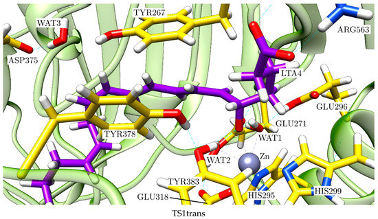 According to the crystallographic structures [18], the catalytic water molecule WAT1 is hydrogen-bonded to two Glutamate residues, GLU271 and GLU296. However, the positions of the corresponding hydrogen atoms are not a priori clear. That is, which of these Glutamate residues, GLU271 or GLU296, is the protonated one is not known. Thus, as explained below, two versions of the protonation state of the LTA4:LTA4H Michaelis complex have been prepared starting from (GLU271, protonated GLU296) or (protonated GLU271, GLU296), leaving all the other protonation states untouched. These two initial structures have been QM/MM-optimised, and the same minimum energy structure was obtained in both cases, showing that the protonated residue is GLU296, as pictured in Figure 2, where the QM/MM partition used is also shown. Thus, WAT1 coordinates to GLU271 through a donor water hydrogen bond, while it connects to GLU296 through an acceptor hydrogen bond. The remaining water hydrogen atom is the one interacting with the oxygen atom of the epoxide. A complete view of this QM/MM-optimised LTA4:LTA4H Michaelis complex is pictured in Figure 3. A scheme of the main noncovalent interactions between the substrate LTA4 and the enzyme LTA4H in this optimised Michaelis complex is shown in Figure 4.
