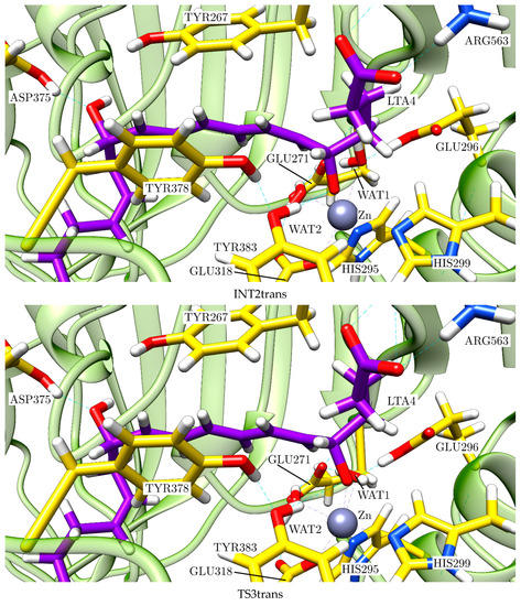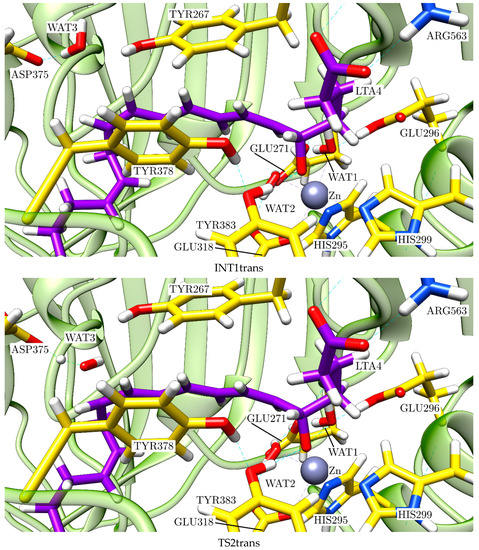Stationary structures of the complete mechanism of the pro-trans reaction path catalysed by LTA4H: TS1trans, INT1trans, TS2trans, INT2trans, TS3trans and Ptrans.