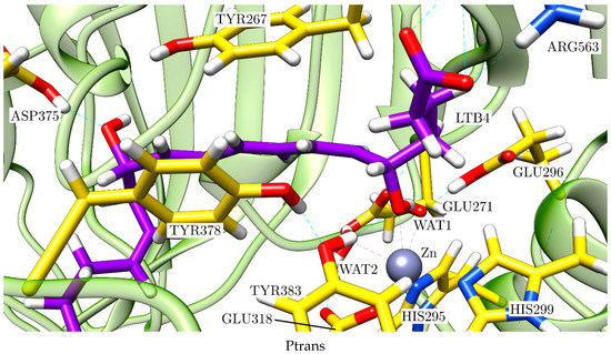 LTA4 fits into the L-shaped hydrophobic cavity of the LTA4H. The substrate docks to the protein through the interaction between the polar head of the LTA4 and ARG563 and LYS565 from the protein, which are located in the depth of the cavity. Thus, the substrate is placed in a head-first conformation. Moreover, this fitting conformation lets the epoxide oxygen move near the Zn environment, while it places C12 near ASP375 (with WAT3 between them). The epoxide is not only stabilised by being in the second coordination sphere of the Zn atom, but also thanks to two hydrogen bonds from TYR383 and WAT1, the catalytic water which is also coordinated to Zn. With this conformation, TYR267 and TYR378 are the two residues closest to the triene moiety of the substrate. The main interactions between the substrate LTA4 and the enzyme LTA4H in this optimised Michaelis complex are schematised in Figure 4. The role of all these residues is to limit the available space and give a shape to the cavity. TYR267 and TYR378 are key residues of the selectivity of the reaction too (see below).
