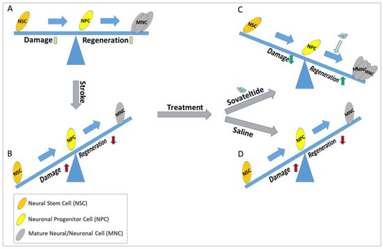 Diagrammatic representation of the effect of sovateltide on neuronal progenitor cell differentiation and neural regeneration after cerebral ischemic stroke. (A) Normal homeostasis, (B) Higher damage than regeneration (probably due to less differentiation of NPCs), (C) Higher regeneration and lower damage after sovateltide treatment (probably due to higher NPCs differentiation), which remains similar after saline treatment (D).