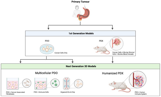 The majority of novel targeted therapies that are being developed for GC and PDAC often fail during clinical evaluation, at least partially due to the fact that current models are not sufficiently reflective of the patient. Taking into account the low prevalence of targetable molecules or mutations [106], there is a great need for the development of innovative research models that are very similar to the human tumour. Multicellular PDO co-cultures and humanised PDX models are presented as next generation 3D methods to include important elements of the TME, increasing model representativeness to the in vivo situation.