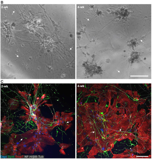 - Oh, Y.; Cho, G.-S.; Li, Z.; Hong, I.; Zhu, R.; Kim, M.-J.; Kim, Y.J.; Tampakakis, E.; Tung, L.; Huganir, R.; et al. Functional Coupling with Cardiac Muscle Promotes Maturation of hPSC-Derived Sympathetic Neurons. Cell Stem Cell 2016, 19, 95–106. [Google Scholar] [CrossRef] [PubMed]