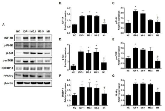 Protein samples were separated using precast gradient polyacrylamide gels (Bolt™ 4–12% Bis-Tris Plus Gels; Thermo Fisher Scientific, Waltham, MA, USA) and transferred to the nitrocellulose membrane (GE Healthcare, Chicago, IL, USA). The membrane was blocked in 5% bovine serum albumin (BSA). The membrane was probed with primary antibodies and horseradish peroxidase-conjugated secondary antibody. The signal intensity was measured with an image analyzer (ChemiDoc™ XRS+; Bio-Rad Laboratories) and quantified using Image Lab software (Bio-Rad Laboratories). The protein expression values were normalized to β-actin (Sigma-Aldrich) expression values. The primary antibodies used were as follows: anti-IGF-1R, anti-phospho-Akt, anti-phospho-mTOR, anti-FAS, anti-ACC, anti-phospho-p70s6k, anti-phospho-p38, anti-Glyceraldehyde 3-phosphate dehydrogenase (GAPDH) (1:1000, Cell Signaling Technology, Danvers, MA, USA), anti-phospho-PI3K, anti-SREBP, anti-PPAR-γ, anti-SCD-1, anti-interleukin (IL)-8, anti-IL-1β (1:1000, Santa Cruz Biotechnology, Dallas, TX, USA), anti-tumor necrosis factor (TNF)-α, anti-interferon (IFN)-γ, anti-IL-6 (Abcam, Cambridge, UK), and anti-β-actin (1: 1000, Sigma-Aldrich).