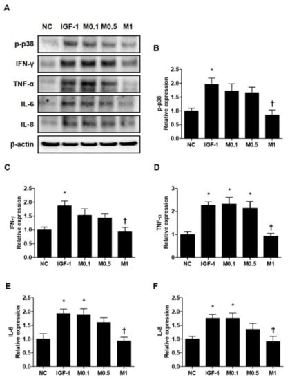 Melittin effectively inhibits the pro-inflammatory cytokine in IGF-1-treated SZ95 cells. (A) Representative cropped Western blot analysis images show that melittin inhibited the IGF-1-induced protein expressions of p38 MAPK and pro-inflammatory cytokines, such as TNF-α, IL-1β, IL-8, and IFN-γ. β-actin was presented as a loading control. (B–F) We quantified the protein levels next. The results are expressed as means ± SEM. * p < 0.05 compared with the NC group. † p < 0.05 compared with the IGF-1 group. NC: normal control; IGF-1: insulin-like growth factor-1; M0.1, M0.5, and M1: 0.1, 0.5, and 1 μg·mL−1.