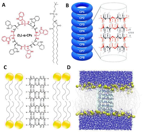 (A). Structures of the D,L-α-CP employed in this study, c-[(L-Trp-D-Trp-)4], and POPC. L-residues are represented in black and D-residues in red. (B). Antiparallel disposition of the CPs in the D,L-α-SCPN; note that the D (red) and L (black) residues are facing one another. (C). Model of the SCPN inserted into a lipid bilayer. (D). Initial structure used for all of the MD simulations, where the SCPN is inserted into a lipid bilayer; water molecules are on both sides of the membrane, while the nanotube cavity and the hydrophobic core of the bilayer are dry; yellow spheres correspond to the POPC phosphorous atoms.