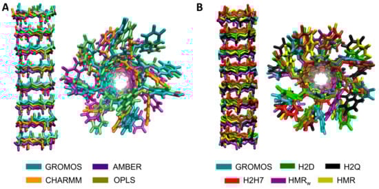 Lateral- and top-view structure alignment of the last snapshot (t = 300 ns) of the SCPN simulated with different classical force fields (A) and the GROMOS-modified force fields (B). For simplicity, only the backbone is shown for the lateral representation. Each color represents a different force field or force field parameterization. The classical GROMOS force field is included in both (A,B) as a reference.