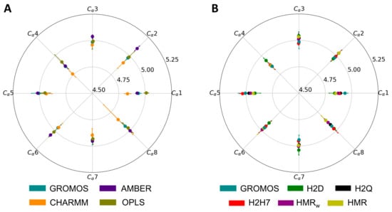 Average radial and angular contributions to the deformation of CP4 determined as explained in the Materials and Methods section, over the last 220 ns of each trajectory. The average radial distance and angle with respect to the geometrical center of the CP (in Å) are indicated in the corresponding circles. Each radial line in the circular bar plot represents the angle expected from an octagonal disposition of each Cα in the CP, while the position of the different solid circles represents the angular deviation with respect to it. The results for each force field are indicated by a different color (see legends). The results for unmodified GROMOS are reproduced in both circular bar plots (A,B) as a reference. Results for the rest of the CPs are shown in Figure S3.