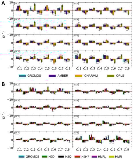 Average values of the angles between the vectors joining each Cα with the center of the CP and the CP plane for the unmodified force fields (A), and for the modified parameterizations of GROMOS (B). The uncertainties in the plot are the standard deviations obtained using the block average method [], multiplied by 1.96 to get the values within a confidence interval of 95%.