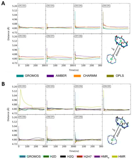 Evolution of the c.o.m. distance (in Å) between pairs of CPs along the trajectory, for the unmodified force fields (A), and for the modified parameterizations of GROMOS (B). Each color corresponds to a different force field, according to the legends.