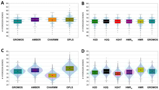 Numbers of H-bonds between CP subunits (A,B) and between the CPs and water (C,D), for the unmodified force fields (A,C), and for the modified parameterizations of GROMOS (B,D), based on the HMR and HIE methods. The grey line represents the median and the red diamond represents the mean of the distributions. The size of the boxes includes data within the second and third quartiles, so that 50% of the data are within the corresponding box. The whiskers, calculated following Tukey’s criteria [], include data on the first and fourth quartiles. Together with the boxplot representation, the distribution of the number of H-bonds is represented by the shadows.