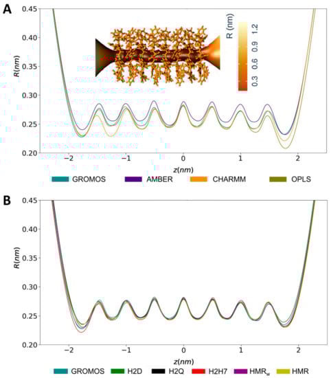 The SCPN structure creates a stable open pore across the lipid membrane. The radius of the cavity along the nanopore axis exhibits a regular pattern, with minima at the level of all of the CP planes, and maxima in the inter-CP regions (Figure 7), in agreement with previous works []. The radius observed for the AMBER trajectory was slightly larger than for other force fields, including those with the modified GROMOS parameters, as anticipated by the longer distances from the Cα to the center of each CP (Figure 3).