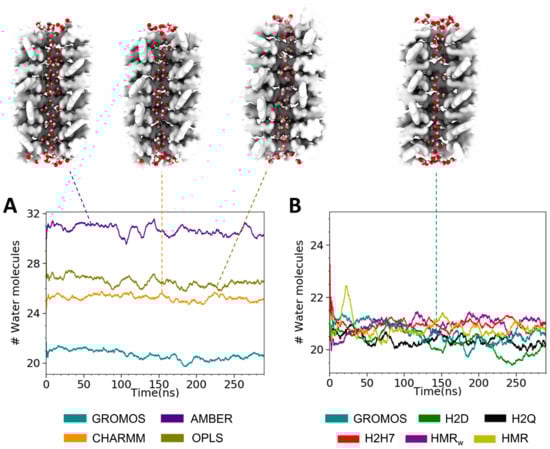 Evolution of the number of water molecules inside the SCPN along the trajectory, for each force field (A), and for the modified parameterizations of GROMOS based on hydrogen mass repartition/increase (B).