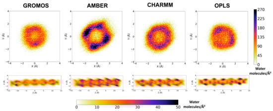 The observed trend in the number of water molecules filling the SCPNs is also reflected in the 2D density maps (Figure 9, Figures S7 and S8) of the confined solvent. The water inside the channels reveals a different pattern for each force field, suggesting higher densities for AMBER and lower densities for GROMOS, in both the transversal and longitudinal directions. No significant differences in the density profiles can be appreciated between the modified force fields, in agreement with the similar numbers and locations of confined water molecules found inside the channels for the corresponding MD simulations.