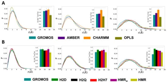 A variety of strategies can be adopted to improve the sampling in atomic resolution simulations [,]. The computational cost of an MD simulation and, thus, the actual time required to obtain a trajectory of a given length with a limited amount of computational resources, depends on several factors, in addition to the size and resolution of the system. The algorithms used to determine the long-range electrostatic interactions and the integration of the equation of motion are two key factors. In recent years, the particle mesh Ewald (PME) algorithm has been widely adopted to solve the first problem in an efficient way []. The second problem depends critically on the time step used to extrapolate the positions of the particles; this parameter should be large enough to allow the significant advance of the system along a trajectory, but short enough to prevent the collapse of the simulation. The presence of fast degrees of freedom in the atomic movements—mainly those of the lightest atoms—restricts the upper limit of the time step to keep the simulations stable. The shortest period of the movement (~10 fs) corresponds to bond stretching involving hydrogen atoms; this restrains the time step to a maximum of ~1 fs in order to have several integrations within a period, thus allowing the stability of the simulation. The 1 fs limit is commonly addressed with the introduction of restraints on the high-frequency bonds, typically using the SHAKE [] or LINCS [] algorithms. In this way, the time step can be increased up to 2 fs. From the mathematical algorithms, it is possible to slow down the fastest movements by artificially increasing the mass of the hydrogen atoms. This kind of manipulation requires formal justification. The hydrogen mass repartitioning (HMR) method [], proposed in 1999, which consists of transferring ~2–3 Da of mass to each hydrogen atom from the heavy atom to which it is bonded, has already been tested for several systems, providing good results []. Using this method, the MD simulations were stable using time steps up to 6–7 fs, thus significantly lowering the computational cost of the trajectories. The HMR method exhibits some problems with AA force fields, in part due to the presence of methyl groups, where three hydrogen atoms are simultaneously bound to the same C atom []; thus, the mass transference of more than 2 Da would result in a pseudo-C atom lighter than each of the bound H atoms. This is not a problem for united atom (UA) force fields such as GROMOS, where only the polar hydrogen atoms are present. Additionally, there is a conceptual issue with the HMR method: it cannot be experimentally reproduced, or even conceived. An alternative to HMR, also intended to slow down the motion of hydrogen atoms, is to directly increase their mass, instead of transferring it from the bound heavy atom. This method has a direct experimental counterpart, since doubling the mass of H atoms is equivalent to a deuteration process, so it will be referred to as the hydrogen isotope exchange (HIE) method here. The mass change of H atoms does not represent the same problem as the HMR method for methyl groups in AA force fields. In turn, this leads to a significant mass gain of the whole molecule, which slows down its internal degrees of freedom as well as its absolute diffusion, eventually cancelling the sampling improvement triggered by the expansion of the time step. Again, the H mass increase is better suited for UA force fields, since the number of polar hydrogens in these force fields is much lower than that of total hydrogens in most biomolecules, meaning that the total mass gain of the whole molecule when increasing the mass of the polar hydrogens is relatively small. Additionally, it is known that polar hydrogens dissolved in deuterated water are more prone to be replaced by deuterium than non-polar hydrogens []. Thus, the mass increase of just polar hydrogens is even more realistic than that of all hydrogen atoms. We have recently tested the effect of a direct mass increase in the explicit/polar hydrogens of cyclodextrin systems under different conditions, using the UA GROMOS force field []. Notably, no significant structural differences in the solute or in the surrounding solvent were observed using different time steps and mass values for the hydrogen atoms []. Extrapolating what happens during experimental deuteration, two heavier H isotopes have also been assayed to increase the stability of the simulations at high time steps: (1) hydrogen 4, or quadium []—an unstable isotope of hydrogen made up of a proton and three neutrons in its nucleus, with a mass of 4.02643 Da; and (2) 7H: an isotope of the hydrogen atom made up of a nucleus of one proton and six neutrons, with a mass of 7.05275 Da []. The actual half-life of these two isotopes is negligible compared to the time scale of classical molecular degrees of freedom, but at least the homologous experiment to this simulation strategy can be conceived, and the simulation with deuterium replacement on the polar hydrogens is fully realistic.