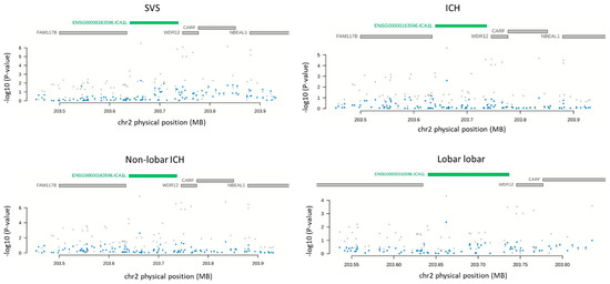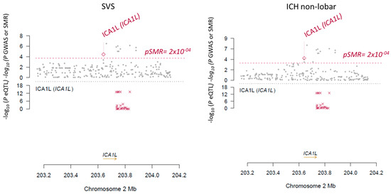 In order to ensure that the genetic association of ICA1L with SVS and non-lobar ICH was mediated by the cis-regulation of the ICA1L protein levels, SMR and a conditional analysis were performed. The SMR results indicated that the pQTL was associated with SVS (p-value = 3.66 × 10−5) and non-lobar ICH (p-value = 1.81 × 10−5) through the ICA1L protein expression regulation (Table 2, Figure 1). Similarly, the conditional analysis plot showed a conditional effect by the expression levels of ICA1L on the GWAS results (Figure 2). Table 2 shows the Summary statistics for the SMR results with the beta (b_SMR) and p-values (p_SMR) for all the significant and replicated associations from PWAS.