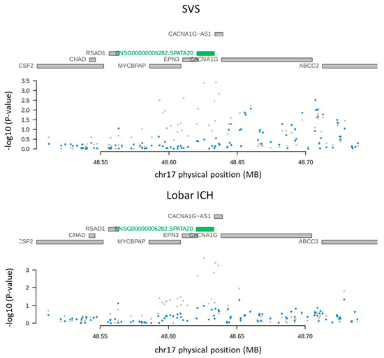 SPATA20 was also identified as a potential protein affecting SVS and lobar ICH. Previous genetic studies using a GWAS found polymorphisms in this gene associated with platelet distribution width [34], reticulocyte count [34], and subcortical volume [35]. However, pleiotropy was not found in the SMR analysis, indicating that different genetic regulations could be mediating the protein abundance and the trait risk.