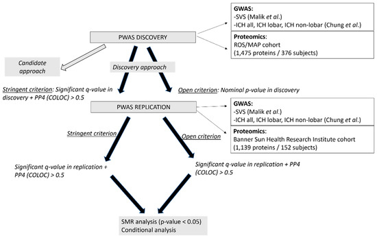 Proteome-wide association studies (PWAS) have been proposed as a novel strategy to recover causal protein-coding genes and to identify new associations for a disease. Since proteins are the focus of PWAS [24], it is a potentially beneficial tool for the identification of drug targets for disease [25]. This method, combined with Bayesian or Mendelian randomization, allows for the identification of gene-phenotype associations causally mediated by protein levels [24,25,26]. We performed a proteome-wide association study (PWAS) to integrate the genomic and proteomic data to discover common mechanisms regulating the two main acute manifestations of SVD: SVS and ICH.