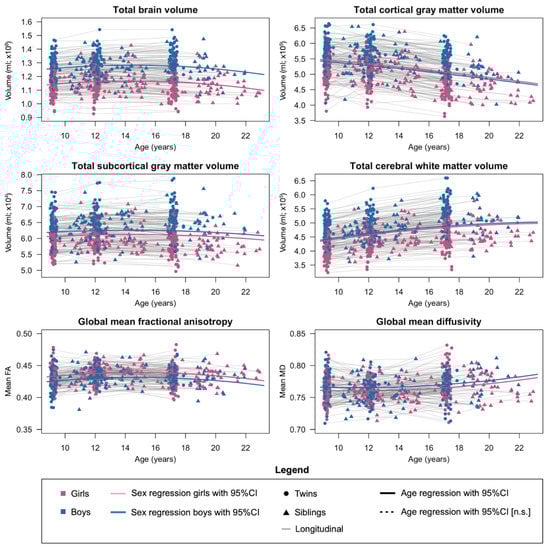 - Brouwer, R.M.; Mandl, R.C.W.; Schnack, H.G.; Van Soelen, I.L.C.; Van Baal, G.C.; Peper, J.S.; Kahn, R.S.; Boomsma, D.I.; Hulshoff Pol, H.E. White Matter Development in Early Puberty: A Longitudinal Volumetric and Diffusion Tensor Imaging Twin Study. PLoS ONE 2012, 7, e32316. [Google Scholar] [CrossRef] [PubMed][Green Version]