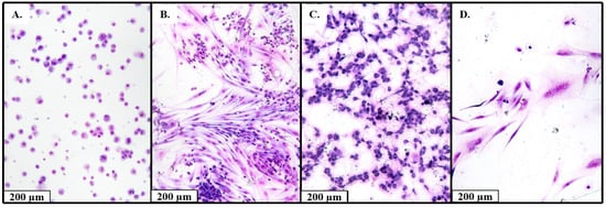 Examples of cytological studies of the derived cell cultures (Leishman stain; 80×). (A) Cell culture obtained from the patient with synovial sarcoma (99% malignant cells), (B) cell culture obtained from the patient with malignant schwannoma (20% malignant cells, 80% lymphocytes), (C) cell culture obtained from the patient with undifferentiated pleomorphic sarcoma (99% malignant cells), (D) cell culture obtained from the patient with liposarcoma (99% of malignant cells).
