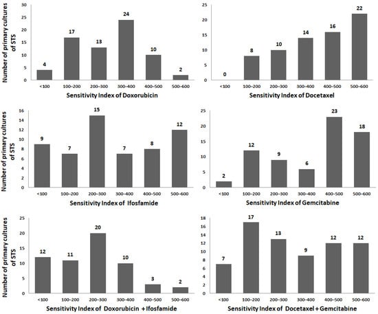 We evaluated the resistance of cancer cells from STS primary cultures to doxorubicin (Dox), ifosfamide (Ifo), docetaxel (Doc), gemcitabine (Gem), and the combinations: (Dox + Ifo) and (Doc + Gem). If the sensitivity index (SI) was less than 300, cells were accounted as sensitive to the drug or drug combination. Figure 2 demonstrates the histograms of SI frequencies for all drugs individually and for drug combinations. It is noteworthy that primary cells revealed the high heterogeneity; therefore, the SI frequencies did not match to normal distribution. Resistant STS are more frequently occurred in case of Doc and Gem: SI > 300 in 74.3% and 67.1% of samples after individual treatment and 47.1% after combination treatment. In case of Dox and Ifo these indexes were 51.4% and 46.7%, respectively, and 25.9% for combination.
