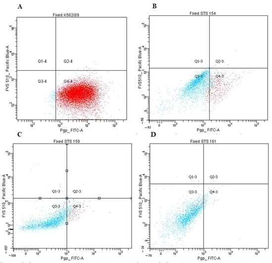 P-gp expression analysis by cytofluorometry. (A) K562/i-S9 cells were stained with FITC-labeled antibodies against Pgp (Pgp expressed by 98.2% cells); K562/i-S9 cell subline were obtained from chronic myeloid leukemia cell line K562 by transduction of MDR1 (ABCB1). K562/i-S9 cells were used as positive control for the determination of Pgp staining. (B) Expression of Pgp in 33.8% of cells in STS 154 (synovial sarcoma). (C) Expression of Pgp in 8% of cells in STS 159 (leiomyosarcoma). (D) Expression of Pgp in 0.7% of cells in STS 161 (synovial sarcoma).
