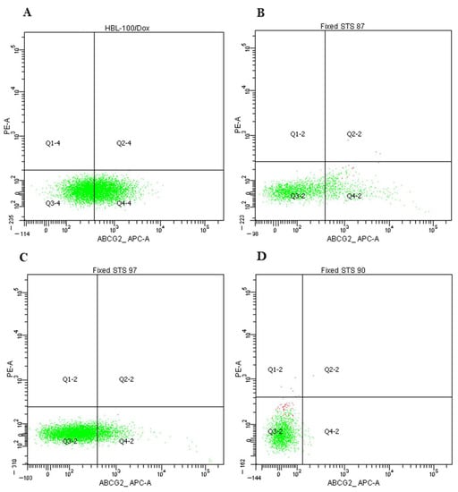 The expression of Pgp and ABCG2 proteins was assessed in primary cultures of STS by flow cytometry on a BD FACSCanto II flow cytometer with BD FACSDiVa software v6 1.3 (BD Biosciences, Franklin Lakes, NJ, USA). Cells were fixed by 4% paraformaldehyde solution in PBS for 10 min, when cells washed twice in PBS. After suspension of 500 thousand cells per point was incubated in 100 μL of PBS with antibodies in the ratio specified in the manufacturer’s protocol for 40 min in the dark at room temperature, then washed twice in PBS. Fixable Viability Stain 510 (FVS510) was used as a marker of cell viability (Biosciences, Cat. No. 564406). The K562/i-S9 cell line with Pgp overexpression (obtained from K562 by transfection with the MDR1 (ABCB1) gene) was used as a positive control. K562/i-S9 cell line was kindly provided by Mechetner [45]. In our laboratory of tumor cell genetics, we were derived a doxorubicin-resistant cell subline of Pgp and ABCG2 (BCRP) overexpressing HBL-100/Dox cell line from the HBL-100 cells (received from Institute of Cytology RAS) after the continuous cell selection in the presence of Dox [46]. HBL-100/Dox cell was used as a positive control for anti-ABCG2 antibody performance. The range of autofluorescence for the samples varied from 0.1 to 10%. Antibodies were used in the work: FITC-Pgp (BD Biosciences, USA, clone 17F9, Cat. No. 557002), APC anti-human CD338 (ABCG2) (BioLegend, San Diego, CA, USA, clone 5D3, Cat. No. 332020).