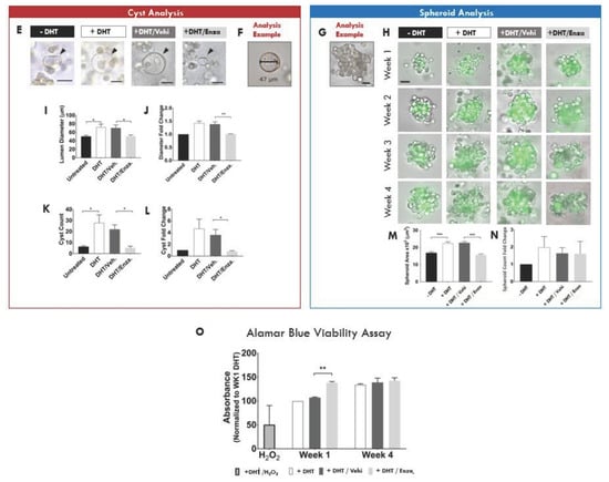 PDX-derived organoids (PDOs) recapitulate heterogeneity and androgen pathway directed therapy (APDT) resistance of the patient’s tumor. (A) Workflow to establish and optimize 3D organoids from patient-derived xenograft (PDX) model of prostate cancer bone metastasis. (B) Representative images of hematoxylin and eosin (HE) stained samples of prostatectomy tissue from the donor patient, PCSD1 intra-femoral xenografts and PCSD1 organoids. Red arrows point to structures seen in both the organoids and xenografts growing in the femur. HE images are shown at 10× magnification. (C) A heterogeneous mix of PCSD1 tumor cells grown in 3D organoid cultures consisting of single cells, hollow epithelial cysts and cell-filled spheroids. Bright-field microscope images of single cells and the spheroid are at 10× magnification and the cyst is at 20× magnification. Scale bars represent 50 µm. (D) Experimental design of 3D cultures of PCSD1-GFP/luciferase expressing organoids under four treatment conditions: -DHT, +DHT (1 nM), +DHT/Vehicle (1 nM/0.1% DMSO) and +DHT/enzalutamide (1 nM/10 µM). PCSD1 organoids in each treatment group were imaged weekly with a Keyence digital microscope for four weeks. (E) A representative image of cysts in each treatment condition after four weeks of treatment. (F) A measurement example of cyst lumen diameter using the Hybrid Cell Counter software. Scale bar for spheroid image is 50 µm. After measurement of cyst lumen diameter, the number of epithelial cysts greater than 50 µm in size was quantified in each culture. (G) An analysis example of spheroid area using the Hybrid Cell Counter software. Scale bar for spheroid image is 50 µm. (H) A representative image of spheroid in each treatment condition at week 1, 2, 3 and 4 of treatment. (I) Average lumen diameter of cysts. (J) Fold changes in lumen diameter. (K) Number of cyst count. (L) Fold changes in cyst count. (M) Average spheroid area. (N) Fold changes in the number of spheroids under four treatment conditions: −DHT, +DHT (1 nM), +DHT/Vehicle (1 nM/0.1% DMSO), and +DHT/enzalutamide (1 nM/10 µM). For fold change analysis in (J,L,N), quantified values were normalized to the DHT- condition. (O) The Alamar Blue viability assay performed on the cultures at weeks 1 and 4. Cell viability was determined using the 50 μL of the AlamarBlue reagent per well in 24-well plate (Invitrogen, by Life Technologies Inc., Carlsbad, CA, USA). Data represent the mean from four independent (n = 4) experiments performed in triplicate ± SEM. A student’s t-test was used to determine statistical significance (* indicate p < 0.05, ** indicates p < 0.01 *** indicated p < 0.0001).