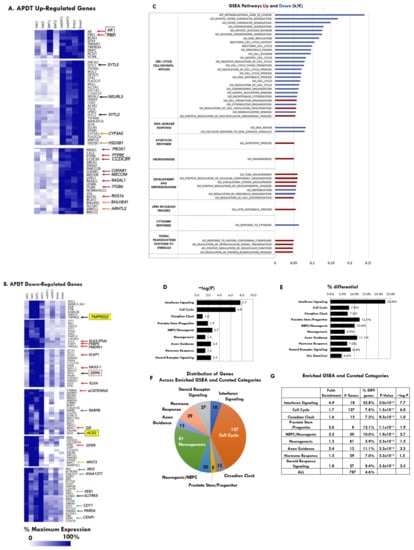 Functional classes overrepresented in up-regulated and/or down-regulated genes in Figure 2 were ranked by the percent of differential genes in the class and further classified according to the overall direction of gene expression change. Hierarchical clustering heat maps of the specific genes were grouped by their GSEA and curated functional pathways. Functional classes with genes consistently up-regulated included neuronal, stem, lipid metabolism, kinases and signaling pathways, including TNFα, WNT and TGFβ (Figure 3A). Functional classes with genes consistently down-regulated under APDT included AR-regulated target genes, cell cycle, circadian cycle and DNA repair genes (Figure 3A).
