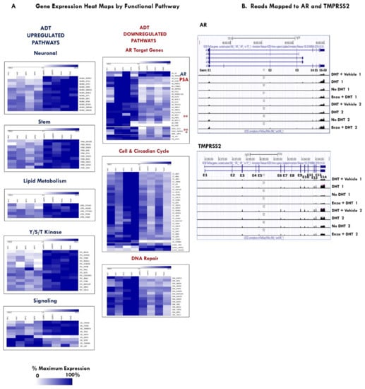 APDT up-regulated and down-regulated genes grouped by functional pathways. (A) Genes were clustered as percentage of maximum expression in functional classes and further classified according to the overall direction of gene expression change as either down-regulated or up-regulated. Gene expression is displayed as percentage of maximum normalized reads per kilobase of transcript per million mapped reads (RPKM). Color scale shows increasing % maximum expression as increasing intensity of blue indicates increasing mRNA expression level while increasing white represents decreasing % maximum expression and mRNA expression. (B) Genome aligned reads mapped to the AR gene in the top panel and the TMPRSS2 gene in the bottom panel. Alignments from top to bottom are Experiment 1: PCSD1 organoid samples treated with DHT+Vehicle, DHT, No DHT, enzalutamide plus DHT then Experiment 2: DHT+Vehicle, DHT, No DHT, enzalutamide plus DHT. AR gene shows accumulated reads under exons E1–E8, and for the TMPRSS2 gene: exons E1–E14.