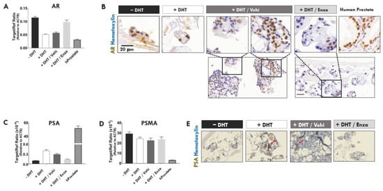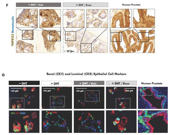 The anti-androgen, enzalutamide, decreased the protein levels of AR and TMPRSS2 in ADT-resistant PDO. (A) Quantitative RT-PCR analysis for AR level in PCSD1 3D organoids under the four treatment conditions: −DHT, +DHT (1 nM), +DHT/Vehicle (1 nM/0.1% DMSO) and +DHT/enzalutamide (1 nM/10 µM). Human beta actin was used as the internal control, reference gene (delta delta Ct target/reference). (B) IHC analysis of AR expression in PCSD1 3D organoids. Representative digital microscope images are shown of AR IHC staining performed on 4% paraformaldehyde fixed, paraffin embedded 5 µm sections from four culture conditions. Human prostate tissue was used as a positive control. (C) Quantitative RT-PCR analysis for PSA level in PCSD1 3D organoids. (D) Quantitative RT-PCR analysis for PSMA level in PCSD1 3D organoids under the four treatment conditions. Graphs represent one experiment performed in duplicate. (E) Immuno-histochemical (IHC) analysis of PSA expression in PCSD1 3D organoids. Red arrows point to PSA positive staining. (F) IHC analysis of TMPRSS2 expression in PCSD1 3D organoids. Representative digital microscope images are shown of (B,E,F) IHC staining performed on 4% paraformaldehyde fixed, paraffin embedded 5 μm sections from four culture conditions. Data represent the mean from four independent (n = 3) experiments performed in triplicate. (G) Confocal FV1000 images of IFC performed on PCSD1 3D organoids and normal human prostate cancer control tissue to visualize the prostate epithelial cell markers: cytokeratin 8 (CK8), a luminal epithelial cell protein, and cytokeratin 5 (CK5), a basal epithelial cell protein along with DAPI nuclear stain. Top five panels: PCSD1 3D organoids and patient prostate cancer tissue showed CK8 protein (red), and CK5 protein (green). DAPI stained the nuclei (blue). Inset (white square) shows further magnified image of organoids in panels 1–4 and normal prostate in panel 5 with CK8 (red) and CK5 (green) immunostaining. In the PCSD1 organoids, immunofluorescent cytochemical (IFC) analysis of CK5 and CK8 revealed heterogeneous expression patterns. Confocal microscope imaging of the control tissue, normal human prostate, showed the expected pattern of CK5+ basal cells and CK8+ luminal cells in glandular structure.