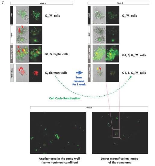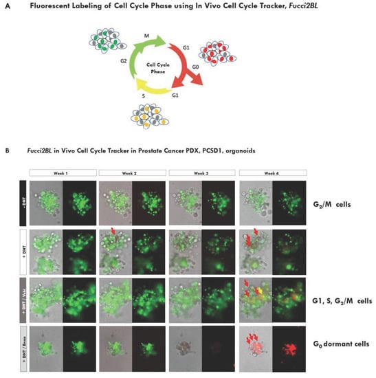 To determine the status of the cell cycle in the live organoids over time, we used the live cell cycle tracker system, Fucci2BL (Figure 5A–C). In the Fucci2BL system the ubiquitin regulated cell cycle sensor, mCherry-hCDT (red fluorescence), is expressed in cells in the G1 or G0 phases of the cell cycle and mVenus-hGEM (green fluorescence) is expressed in G2/M cells (Figure 5A) []. The cell cycle sensors, or probes, overlap in expression in S phase (yellow fluorescence). By 4 weeks, the majority of PCSD1 organoids in +DHT/Enza shifted to the bright red fluorescent G0 phase while the organoids in +DHT/Vehicle contained cells in the green fluorescent G2/M phase, yellow S phase or red G1 phase, indicating they were cycling (Figure 5B). Enzalutamide/+DHT containing media was then removed from PCSD1 organoids after 4 weeks of treatment and replaced with Vehicle/+DHT media. Microscope images taken 1 week after of removal of enzalutamide media and replacement with Vehicle/+DHT media for a total of 5 weeks of growth in the same wells, showed that cells expressed red, green and yellow fluorescent sensors indicating they had reactivated the cell cycle as shown in Figure 5C and Supplementary Figure S4. Therefore, removal of enzalutamide reversed exit from the cell cycle to G0 showing that the inactivity of the cell cycle was temporary. These results, taken together with the gene expression profiling results showing down-regulation of cell cycle genes, are consistent with the live Enza-treated PCSD1 cells shifting to a reversible G0 phase over time and thus, becoming dormant, castration-resistant bone metastatic prostate cancer cells.