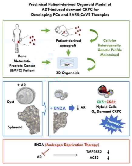 Androgen pathway directed treatment of organoids from a patient-derived xenograft of bone metastatic prostate cancer led to dormant, castration-resistant prostate cancer cells with novel characteristics. Dormancy was reversible upon removal of the anti-androgen, enzalutamide. The APDT-induced dormancy-associated gene expression profiles showed down-regulation of cell cycle, cell division, DNA repair and circadian cycle pathways with up-regulation of stem-cell transcription factors, steroidogenic and neurogenic pathways reminiscent of those seen in bone metastasis prostate cancer DTCs, chemo-resistant persister cells and the embryonic diapause-like (EDL) signature in dormant, chemo-resistant breast cancer organoids. In addition, APDT decreased levels of the SARS-CoV-2 host cell viral entry factors, TMPRSS2 and ACE2, thus, the PDX organoids may be used to test therapies that decrease viral entry of SARS-CoV-2 and its variants for immunocompromised patients in whom vaccines may not be protective. The bone metastatic prostate cancer PDX organoids can be used as models to develop therapies that target the APDT-induced dormancy signature in order to eradicate dormant CRPC cells.